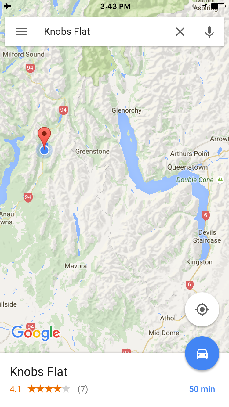 was relatively cooperative, although the drive was somewhat long, Knobs Flat being only about 30 km from Queenstown as the crow flies, but about 5-6 times as far by road. We eventually arrived,