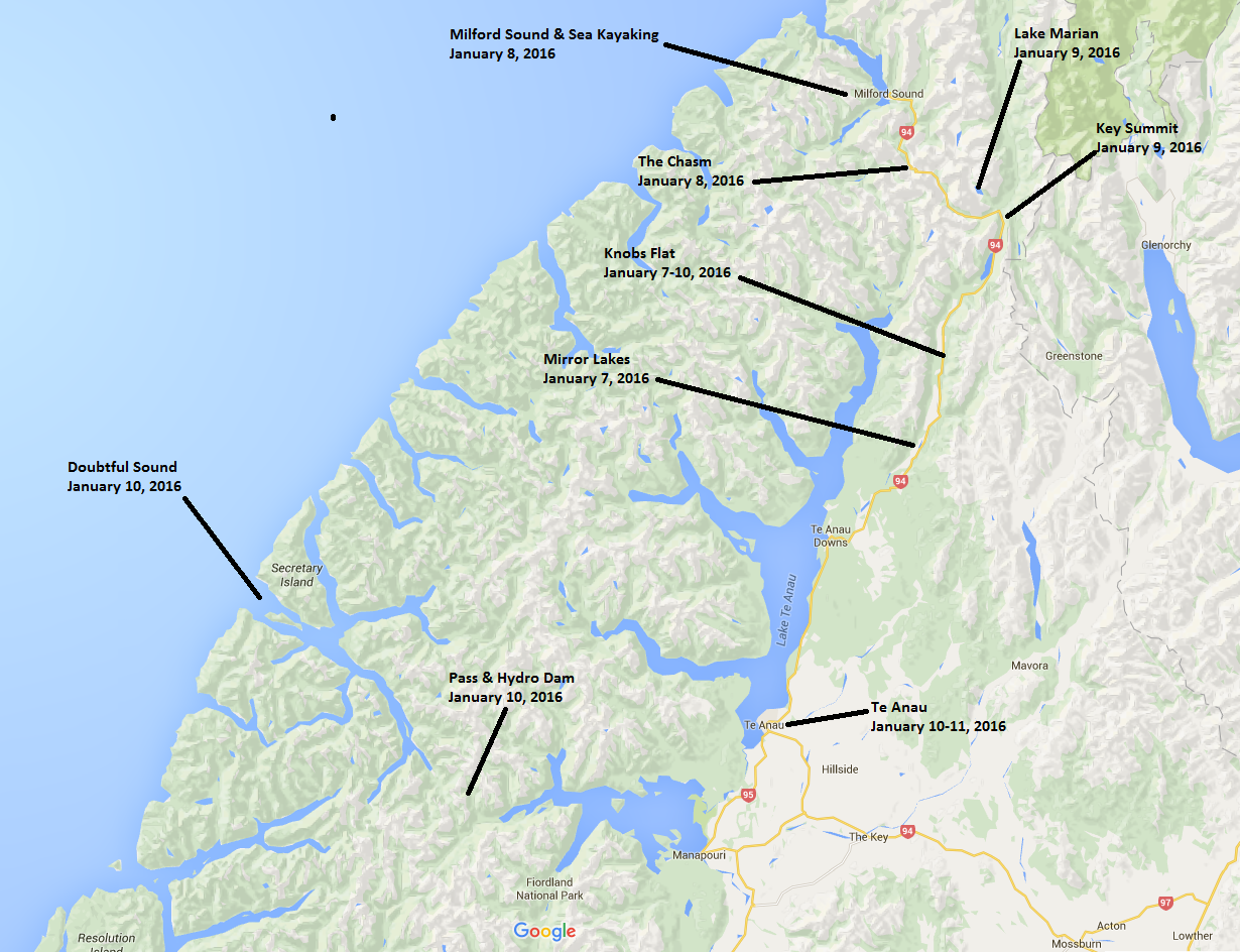 next three days, as there was little dining near Milford sound. After a breakfast in the parking lot of muffins, we headed south towards Knobs Flat, where we would stay the night. Weather