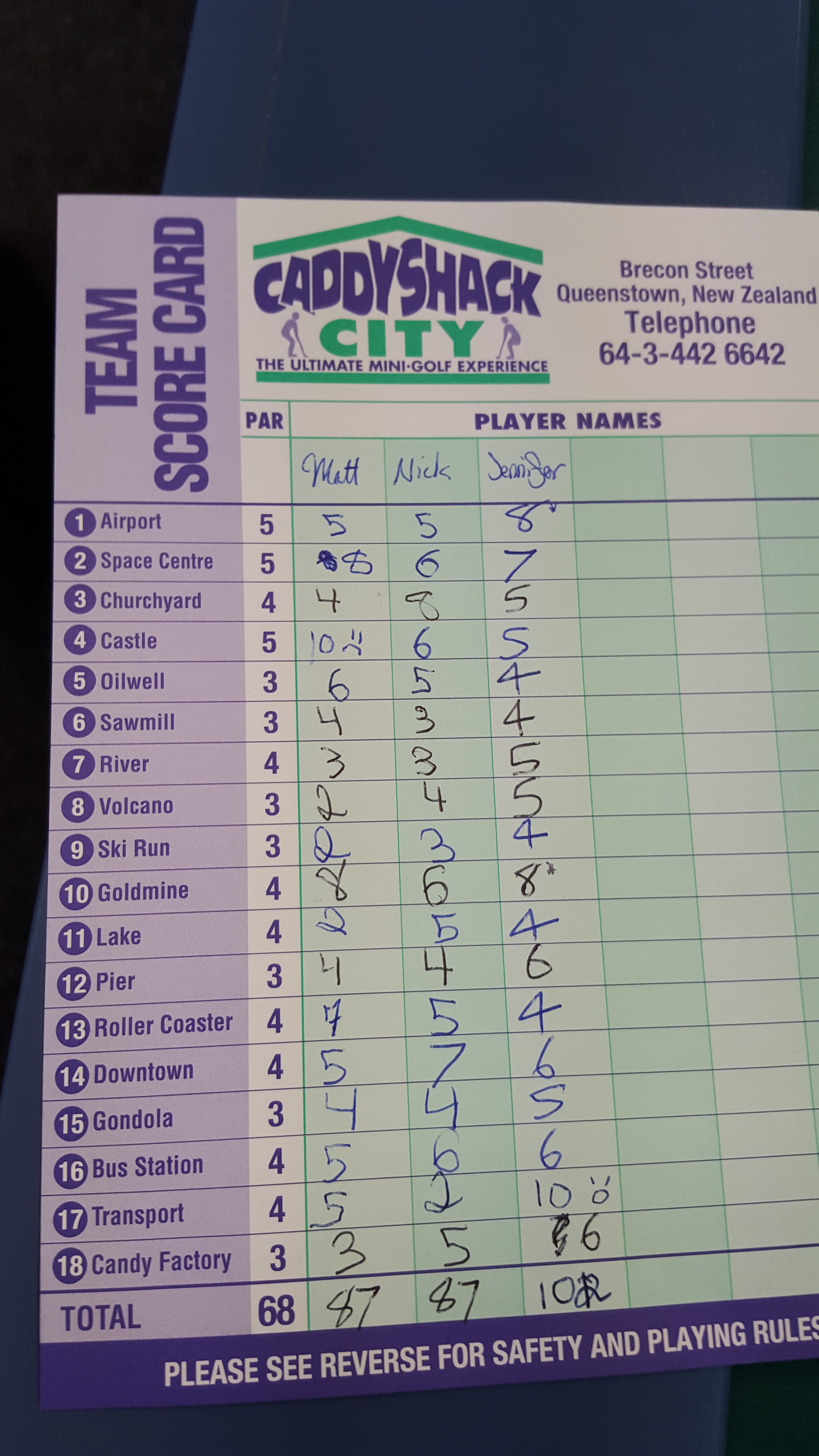 The course was excellent, and after a complete 18 holes that featured a mock rocket launch as well as a ball ski-lift, Nick and I tied at exactly 87 strokes each. Jen had several