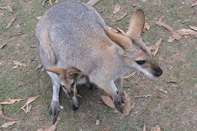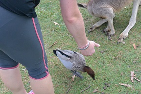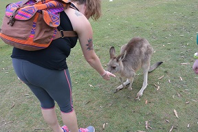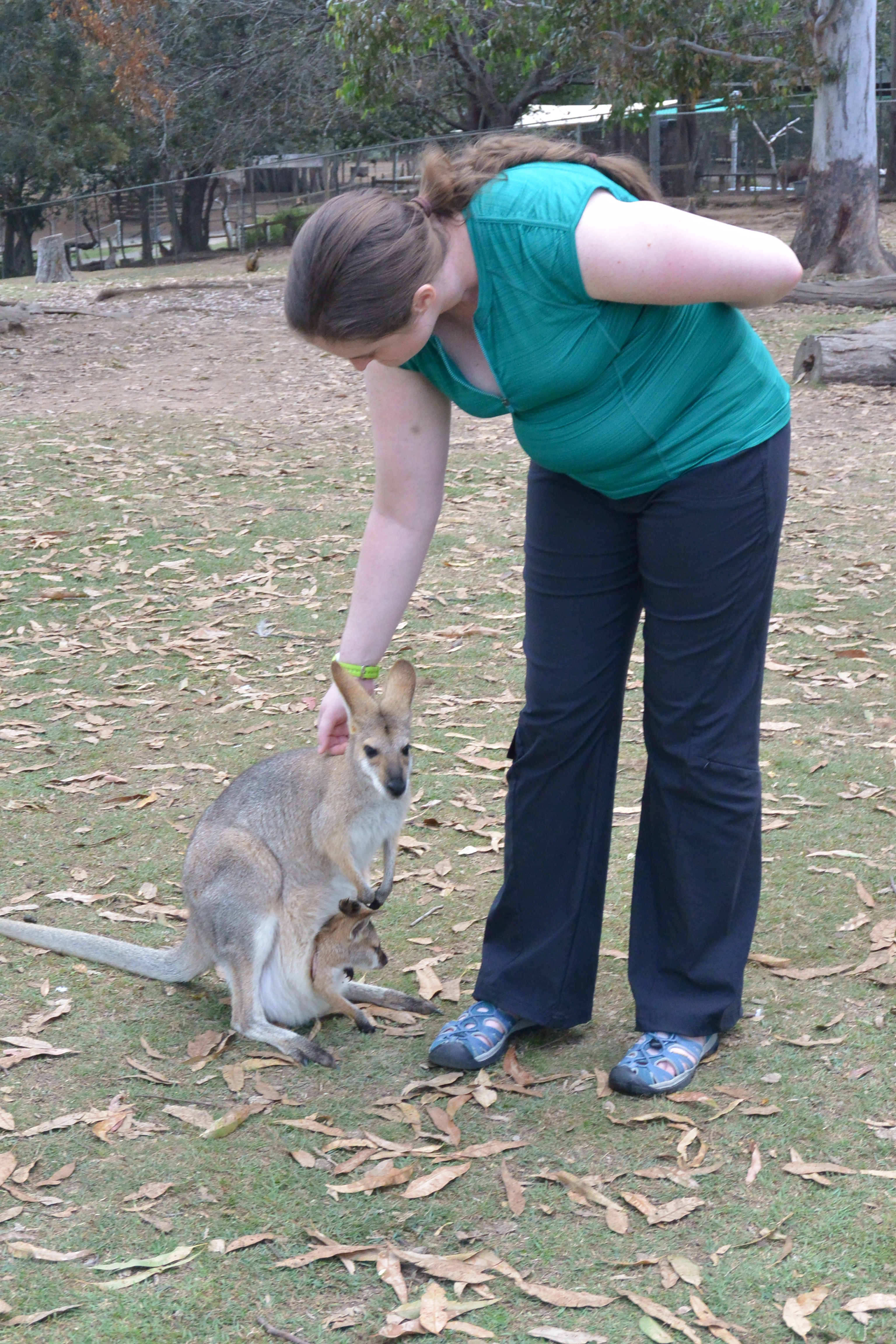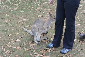 The wine made everyone pretty mellow, but we nonetheless headed over to the koala sanctuary, back in Brisbane. It was worth the trip. We got to see koalas and their babies in their pouches up close. They had an open pen where you could (dodge emus) feed and pet the kangaroos. We didn’t have any food, but some of the kangaroos got up pretty close to us. One mother with her somewhat oversized joey in her pocket came right up to me and started sniffing my feet and leg. I petted her a little bit, but I didn’t want to startle her since she had her baby with her. I suppose I shouldn’t have been so concerned. These were pretty domesticated kangaroos that seemed largely unconcerned with our presence.