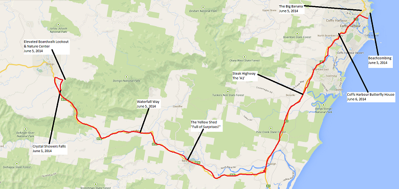 We had a second day in Coff’s Harbour. The morning was pretty gloomy and there were surfers on the beach. Well, there were like two surfers and a bunch of people bobbing up and down while sitting on their surfboards. We went to breakfast at some restaurant Nick had found somehow, which was much, much better than dinner. Apparently pancakes with ice cream are a thing here. I did not partake.