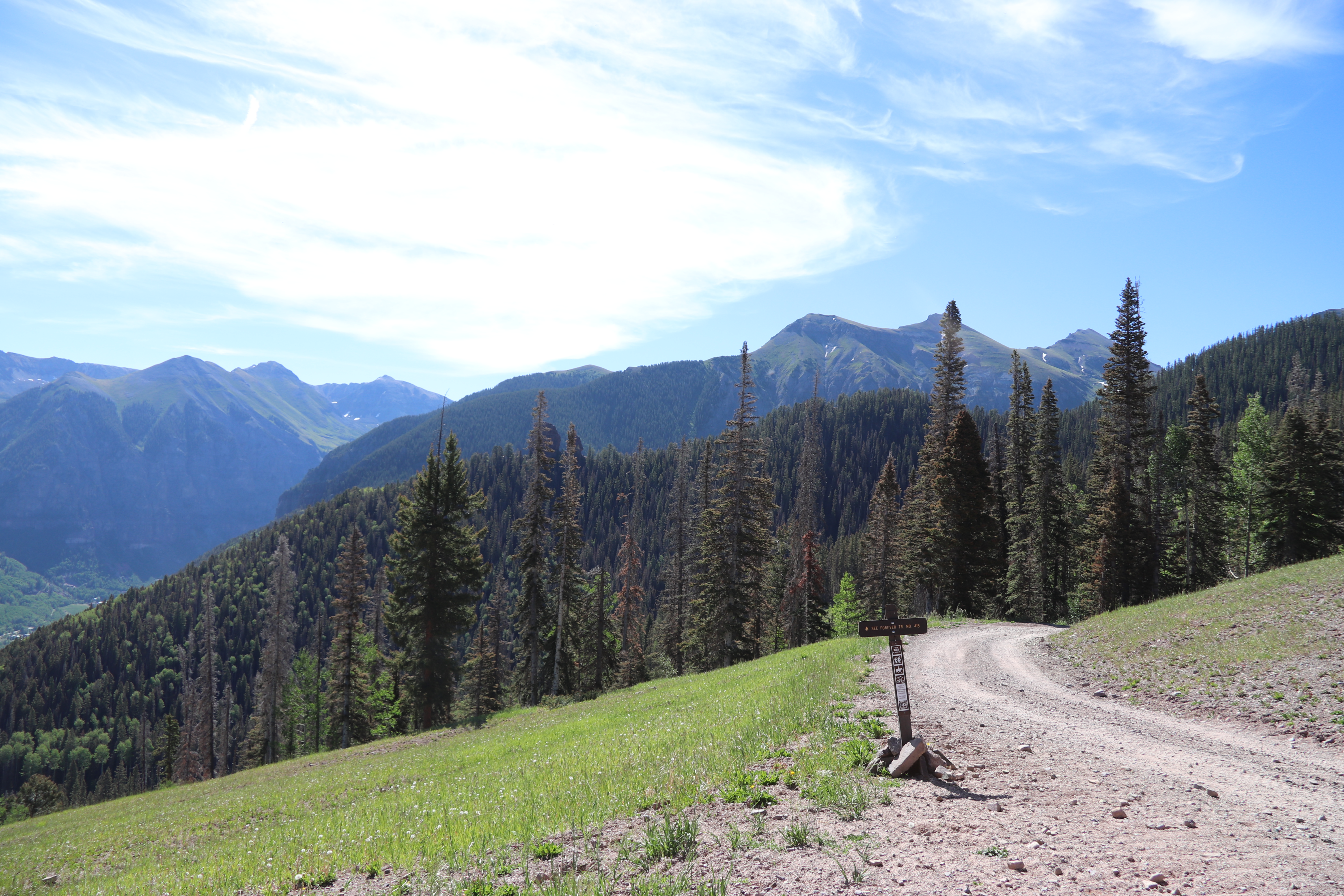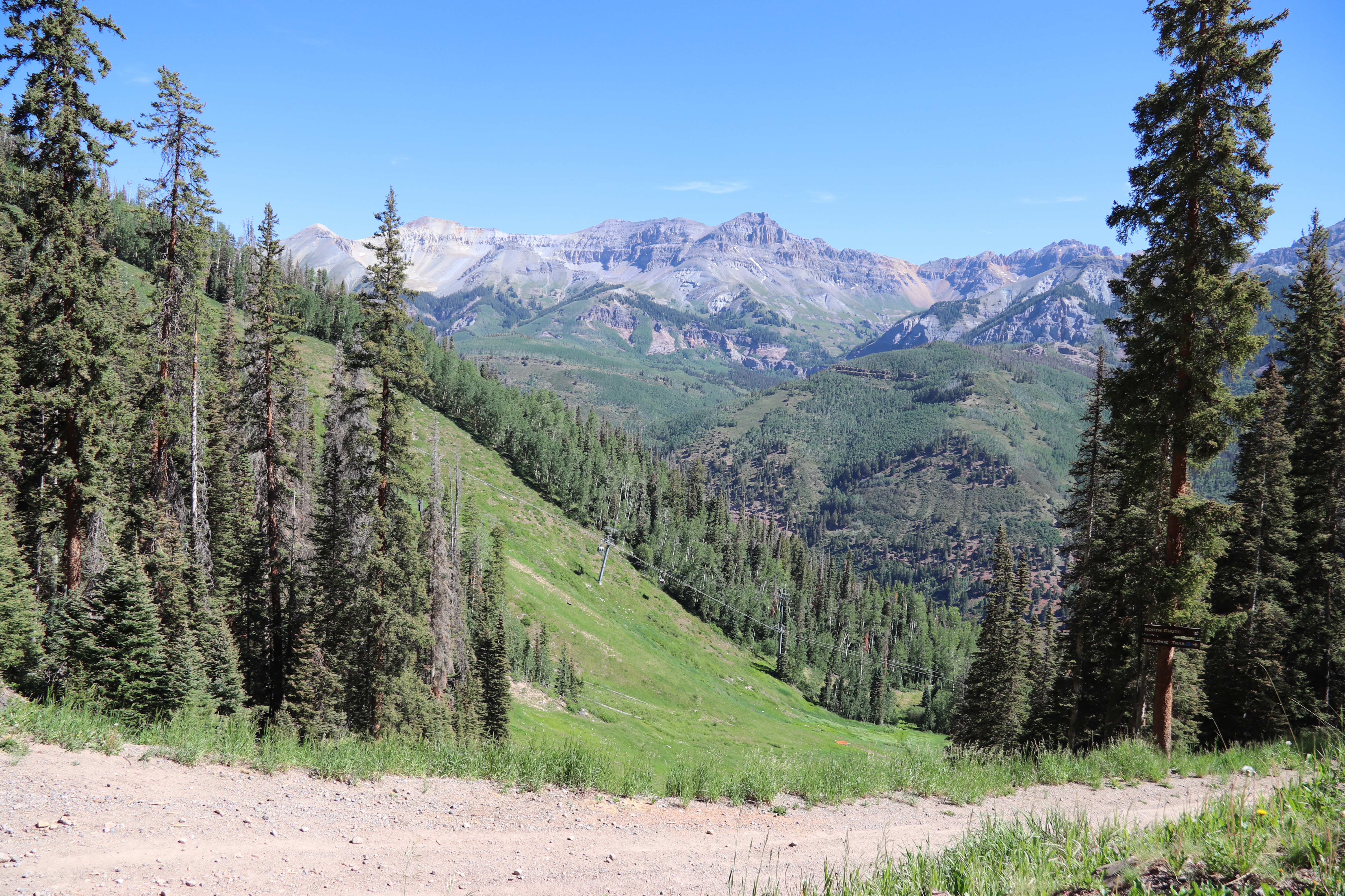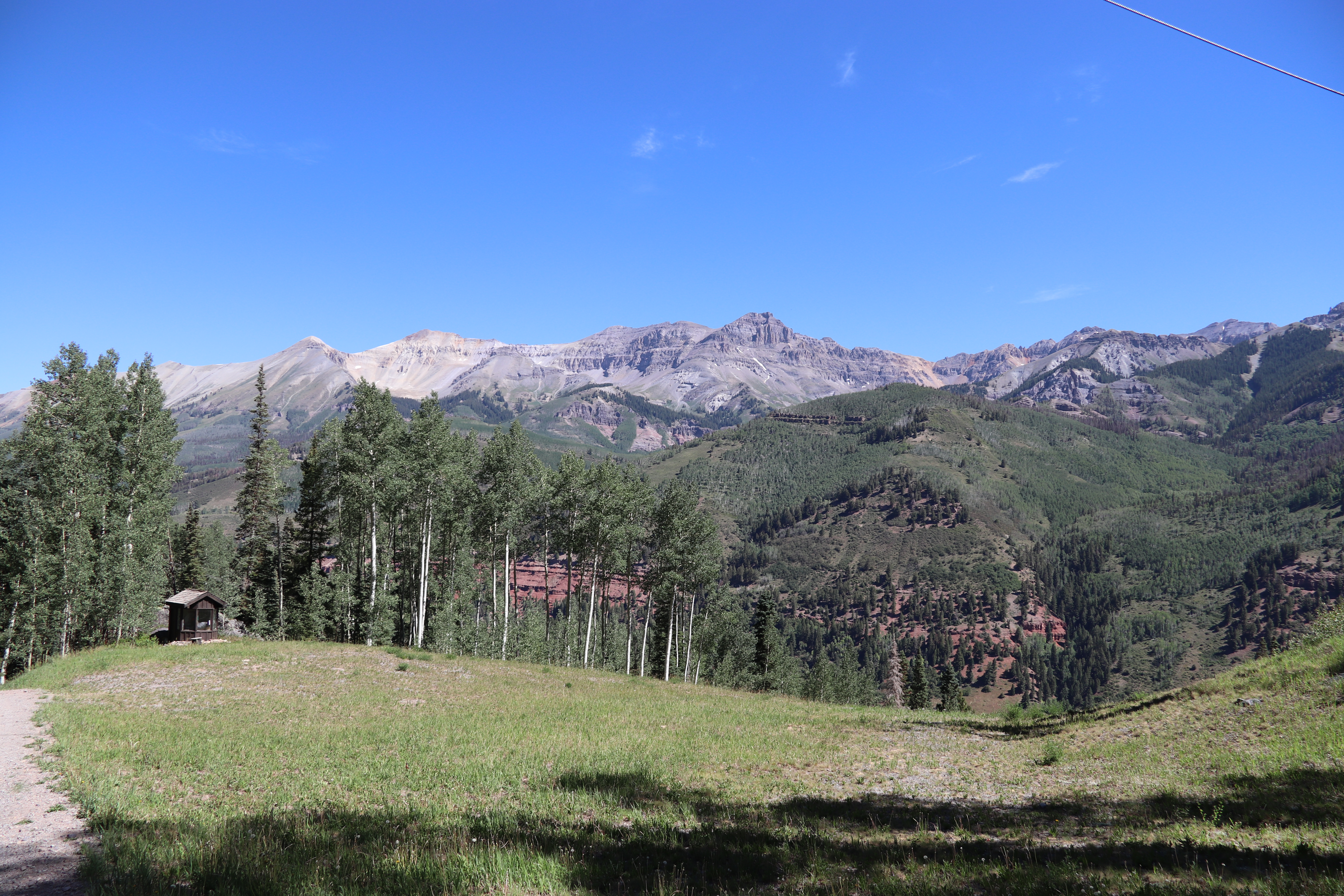 Jens leg fortunately had suffered painful but superficial injuries, and we decided to take the free gondola up to the peak overlooking town and hike down the trail there to the town of telluride (our hotel was actually in the ski resort a valley over from the town). The weather was clear and cooler than it had been at Durango’s lower elevations, and the path was a gravel road in good condition.