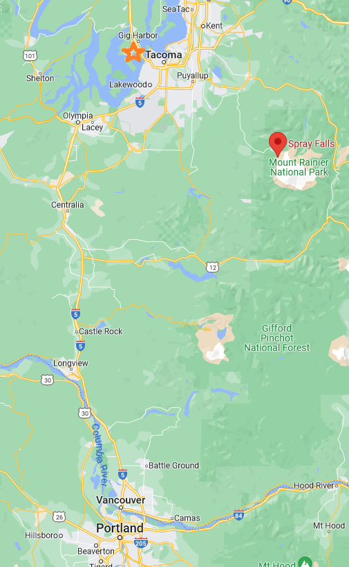 After traveling north, we cut over to Mt Rainier for a hike to Spray Falls, before heading back west to our new base in Gig Harbor.